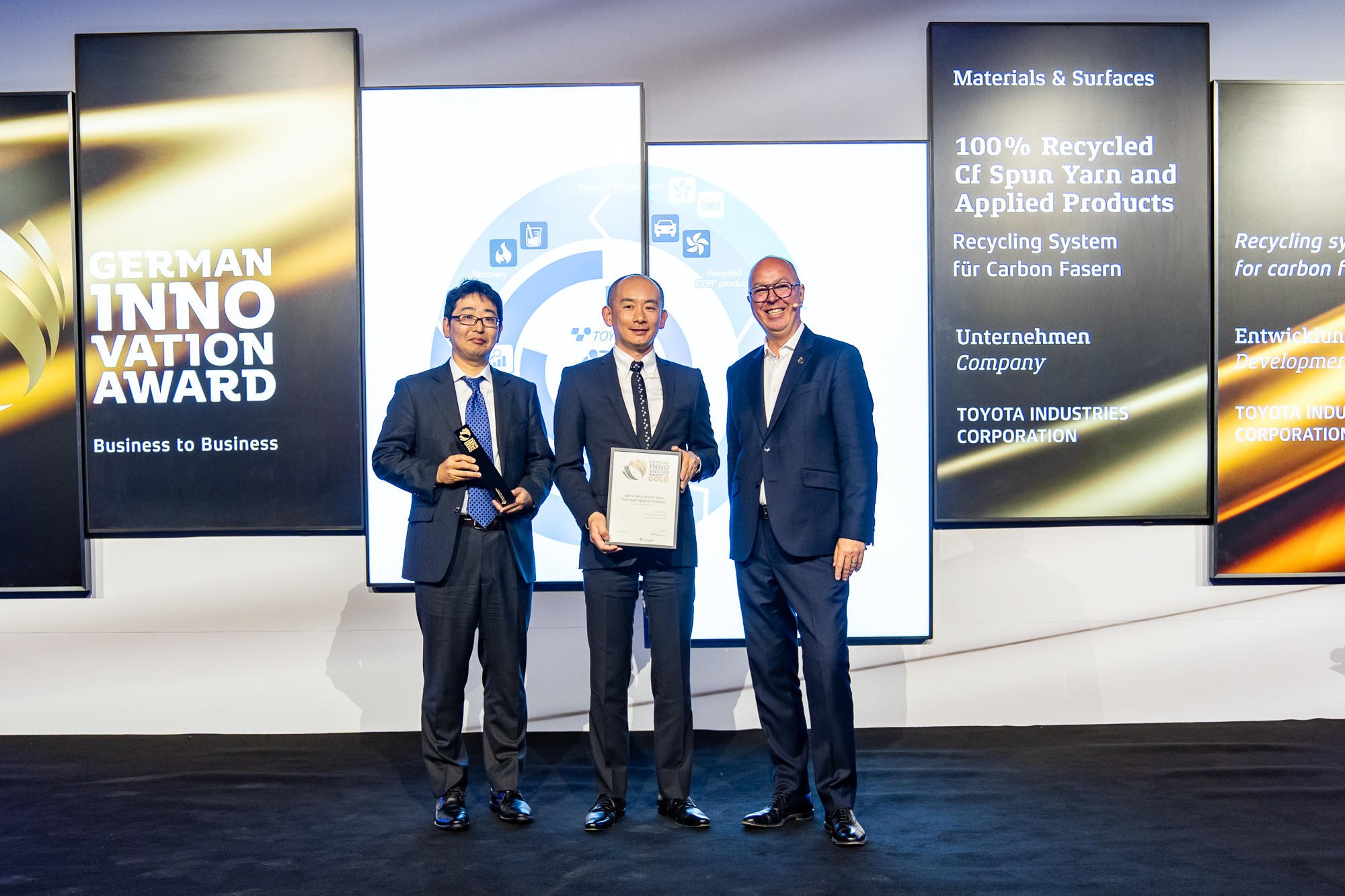 Toyota Industries Corporation became the first Japanese company to win the Gold Award (Materials & Surfaces category), the top award of the German Innovation Award 2024, for its carbon fiber reinforced plastics (CFRP) recycling technology and the comprehensive CFRP recycling system that Toyota Industries aims to build.