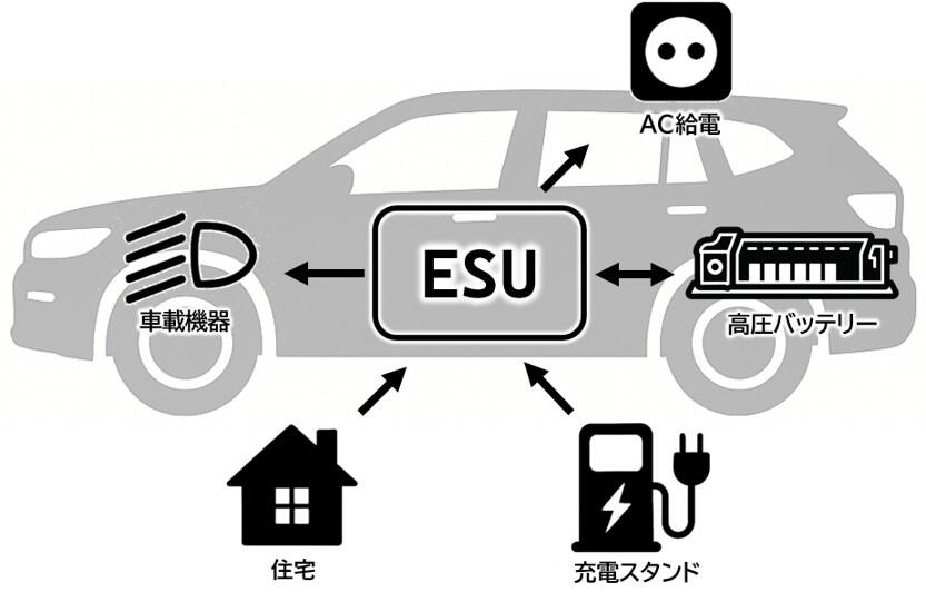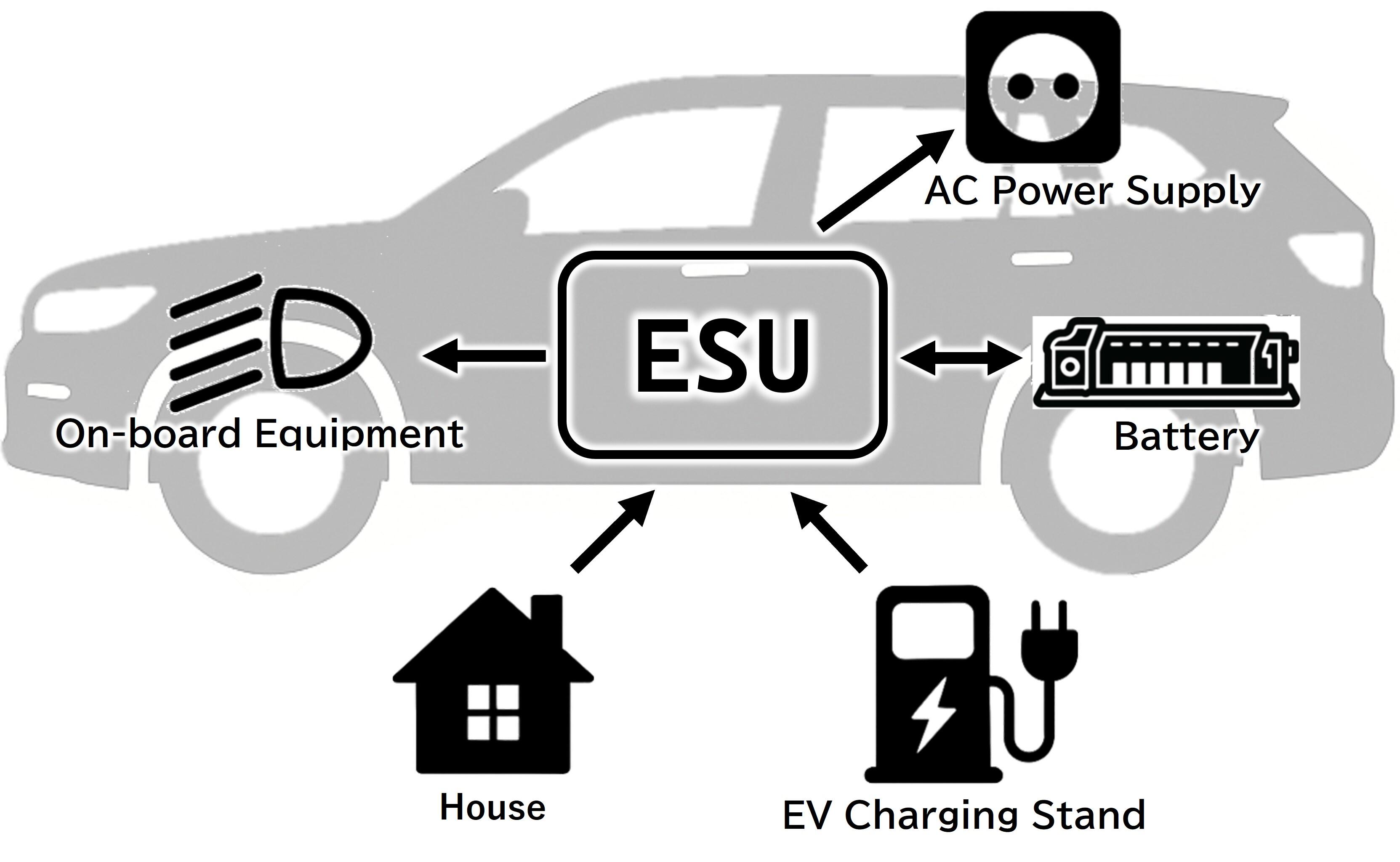 The ESU is a critical power electronics component that enables BEVs to use electrical power efficiently. It integrates standard charging and rapid charging functions, power supply functions, DC-DC conversion (voltage conversion) functions, and power distribution functions. It is involved in charging using an EV charging stand, supplying power to home appliances, and powering electrical devices within vehicles.